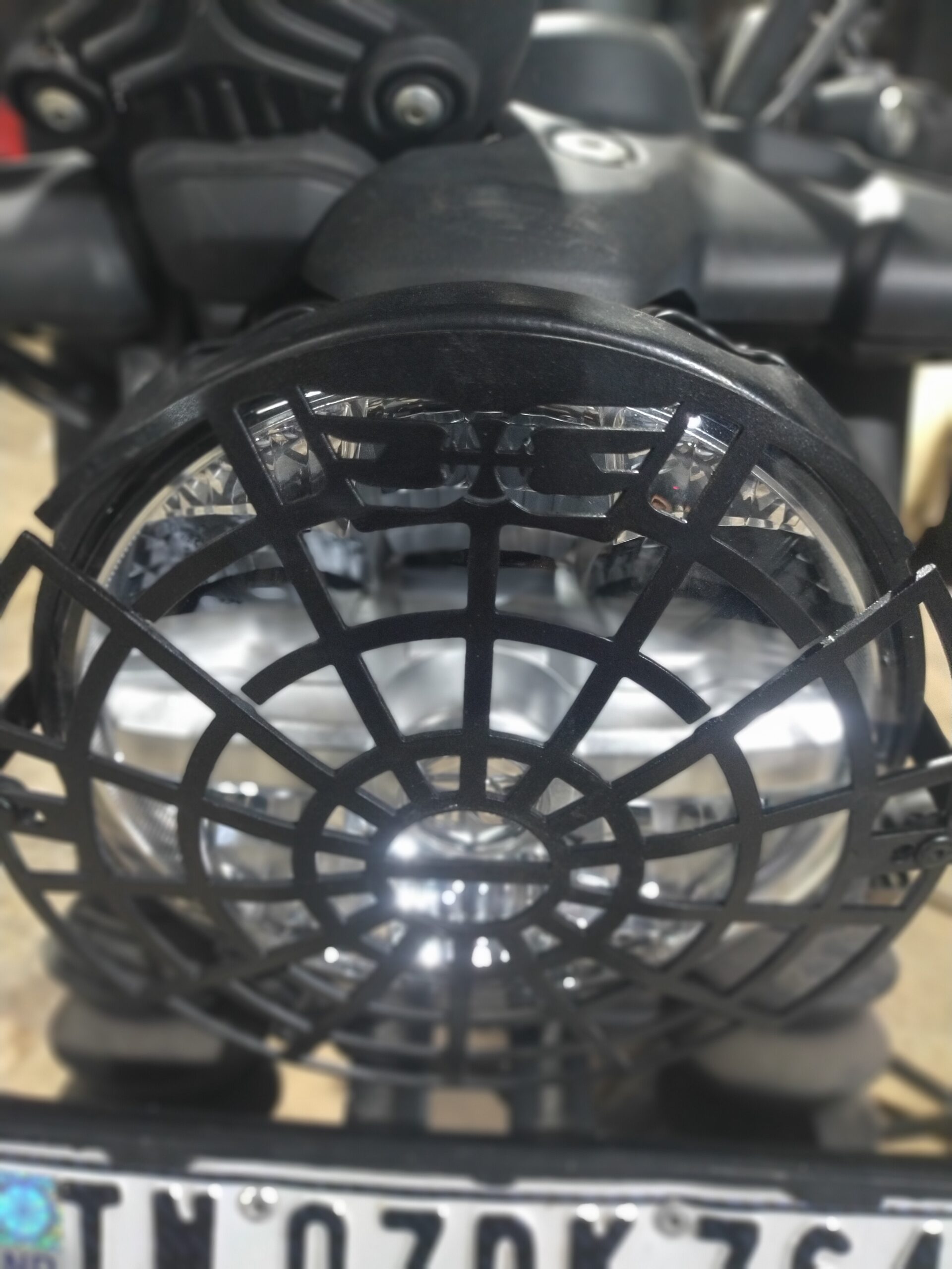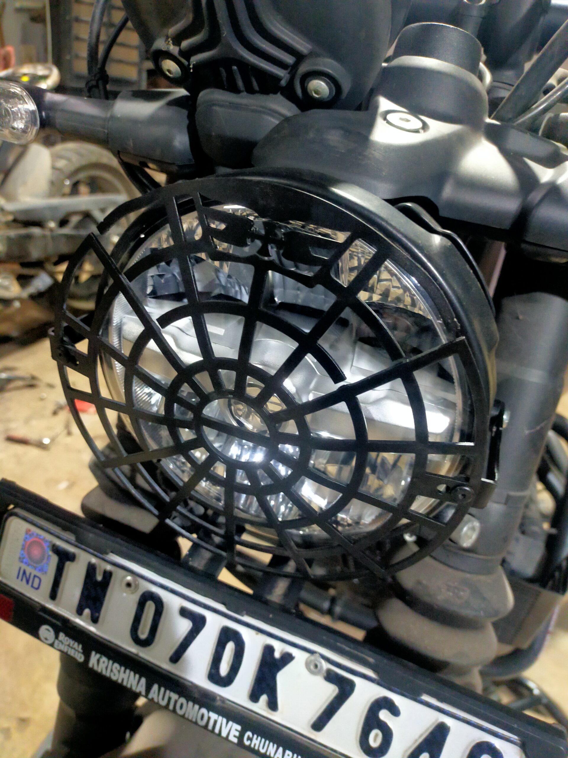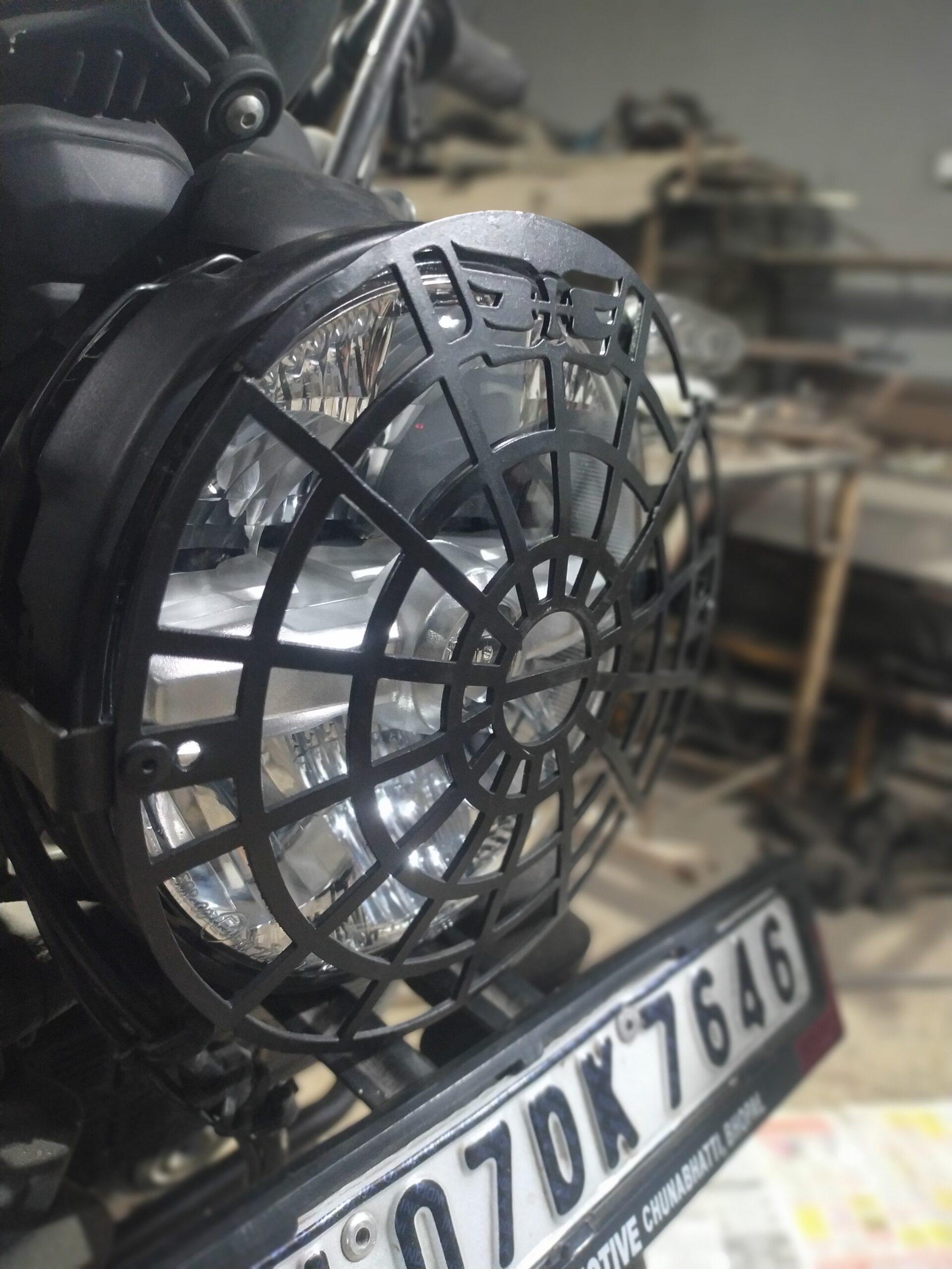 This premium headlight grill/guard is precisely designed for Royal Enfield Himalayan 450 and Guerrilla 450. Made from high-strength carbon steel with a solid 3 mm thickness and a 7.2-inch radius, it delivers excellent protection against stones, debris, and off-road impacts. The precision laser-cut design ensures maximum headlight visibility while safeguarding the lens during touring and adventure rides. Finished in durable black matte or black gloss coating, it offers corrosion resistance and long-lasting performance. Easy bolt-on installation requires no drilling or modification, making it a perfect upgrade for riders seeking protection, durability, and rugged styling.